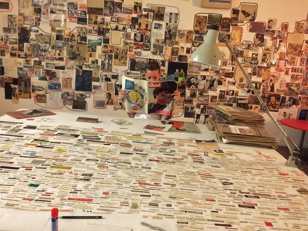 Wenn Eva Noack in ihrem Atelier arbeitet, hängt ein Schild an der Tür. Bitte nicht klopfen, steht da drauf. Das ist gar nicht so sehr als Bitte gemeint, sondern eher als Hinweis an die Außenwelt zu verstehen – ich bekomme gerade nichts mit, ich bin zwar da, aber eigentlich bin ich gerade in meiner Kunst. Kommt später wieder!Die Künstlerin taucht dann für Stunden ab, versinkt in Stapeln alter Zeitschriften, die aus den Jahren 1949 bis etwa 1970 stammen. Das können Frauenzeitschriften wie Die kluge Hausfrau sein, Do-it-yourself-Hefte wie Faller Modellbau oder auch ein altes Exemplar des Nachrichtenmagazins Der Spiegel, Tierzeitschriften sind darunter und auch Illustrierte wie Quick und Kristall oder Männermagazine wie der Playboy. Sie sind das Material für Noacks neue Arbeiten, die aus Texten und Bildern bestehen. Es sind Zeitungsausschnitte, gefundene Wörter, Ausrufezeichen, kleine Figuren, die während des Arbeitsprozesses auch schon mal verschwinden und dann unverhofft aus einem Berg von Papierfetzen wiederauftauchen, vergessene Sprache und poetische Fragmente, die zusammengesetzt eine ganz eigene, bezaubernde Welt ergeben.